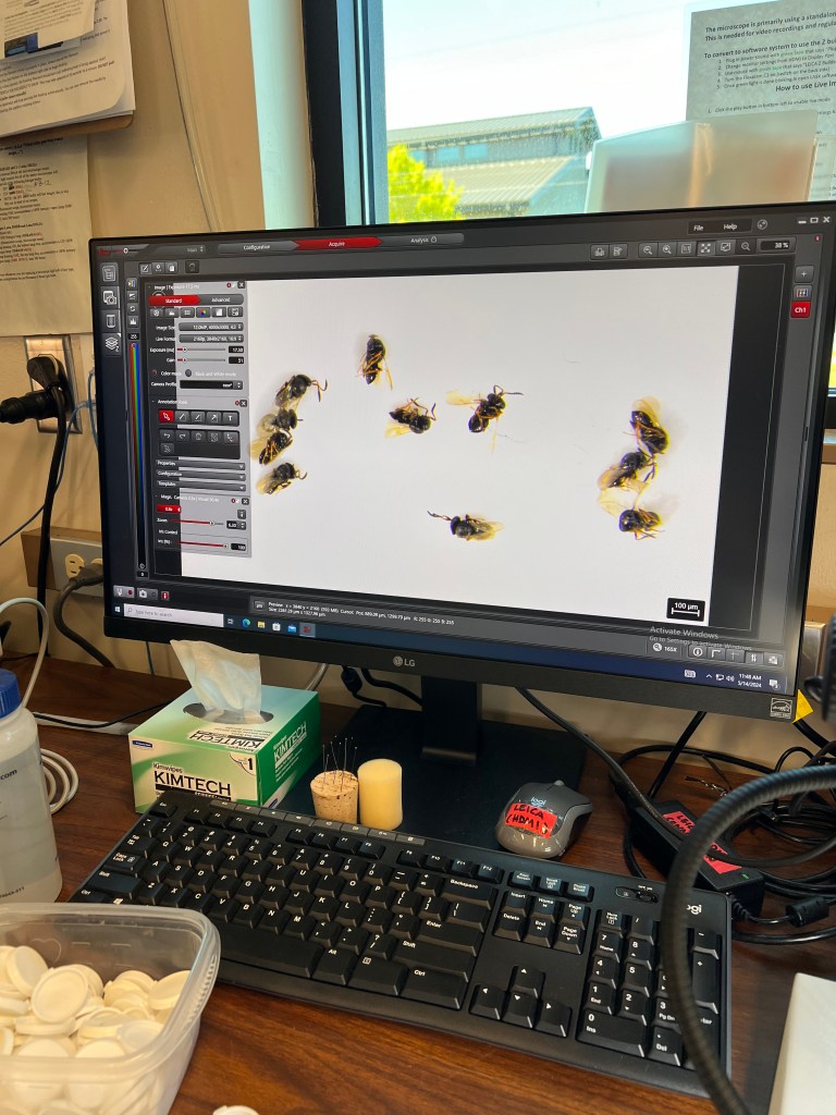 Using LAS X software with a Leica microscope to measure the tibia length of a parasitoid wasp as a proxy for body size, and then comparing this measurement with egg load from a dissected ovary.