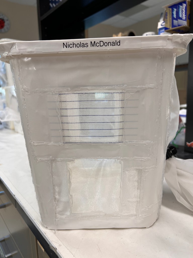 The container is a large white plastic hydroponic pot that has been modified. A clear acrylic square has been affixed to the top. Rectangular holes have been cut on the sides with clear organza fabric affixed over these holes to provide better visuals and better airflow to the interior. A rectangular hole has been cut in the front, as well, with an organza fabric cylindrical sleeve affixed in order to provide access to the interior while limiting the ability for insects to escape during access. This is tied up, of course, when the augmentorium is in place. On one side, a mesh screen has been affixed that is of a gauge (size) that allows transit of parasitoid wasps between the interior and exterior, but is still too small for SWD to travel through. Inside is a HOBO data logger (though, Govee makes a cheap alternative hygrometer that is useful), and a modified plastic storage container that has been cut using a Dremel to act as a shelf with access to the underneath.